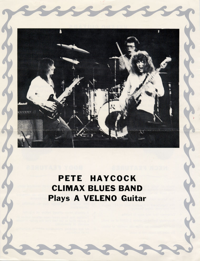 Back of brochure shows Pete Haycock of the "Climax Blues Band" Playing a "Veleno®".