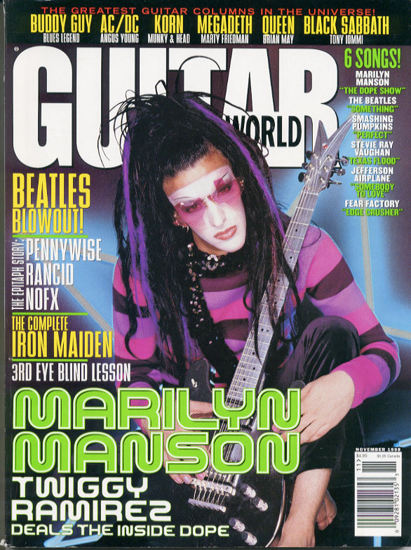 Cover of November 1998  issue of Guitar World magazine showing a "Veleno®" guitar with Marilyn Manson.  The guitar is stated as being a gift from Johnny Depp.